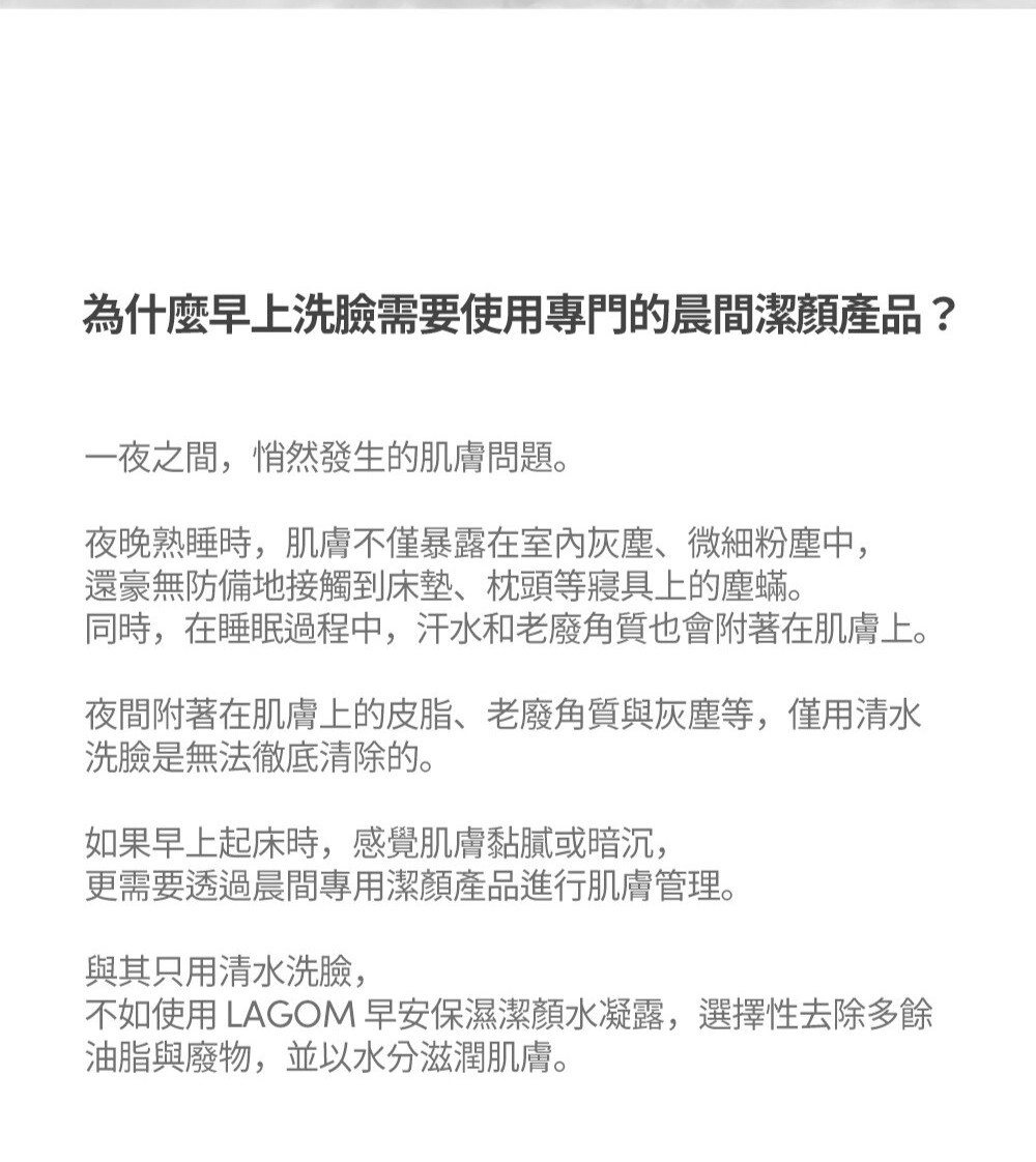輕柔洗去夜間堆積的皮脂與髒污。